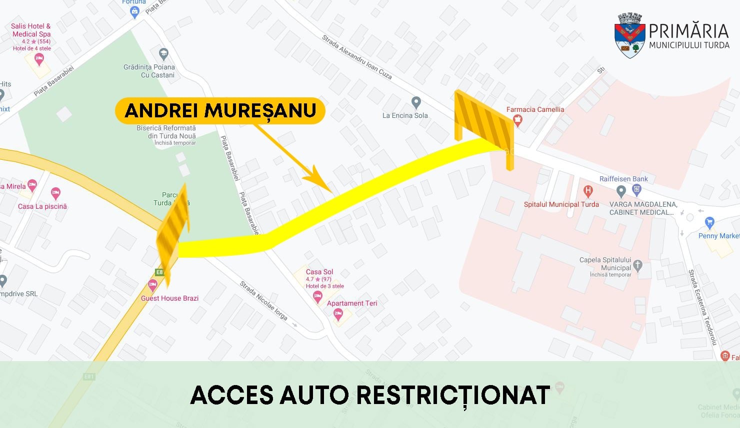 Pe această cale, rugăm locuitorii din zona restricționată să elibereze amplasamentul de mașini deoarece pe durata lucrărilor nu va fi posibil accesul auto la proprietăți.