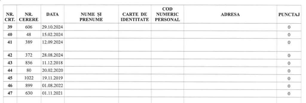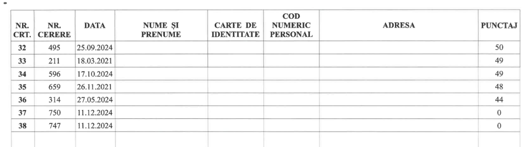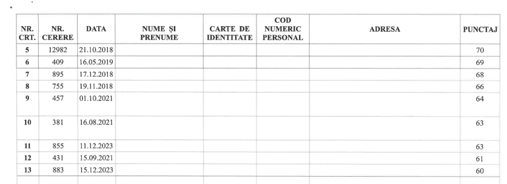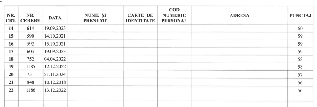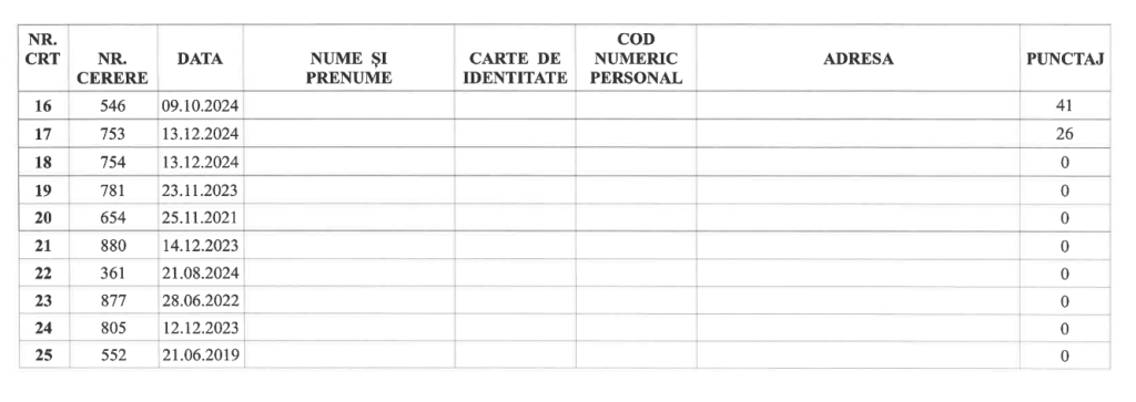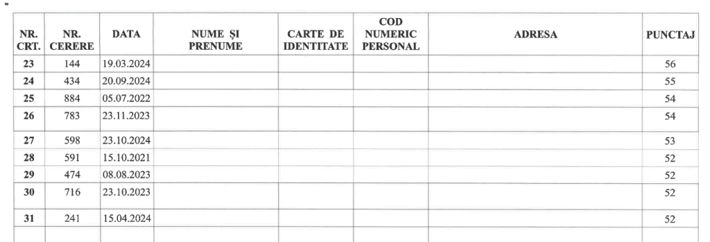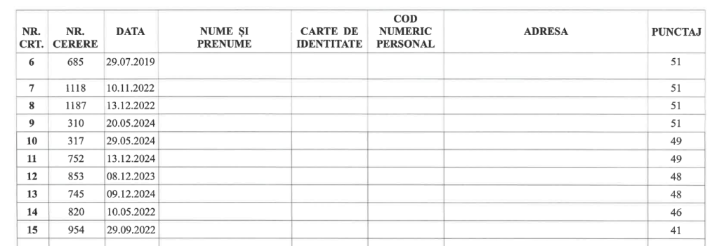 Pentru dosarele admise în Faza A, Comisia a acordat puncte pe baza criteriilor prevăzute de lege (venit, vechimea cererii, situația familială, condiții locative actuale etc.).