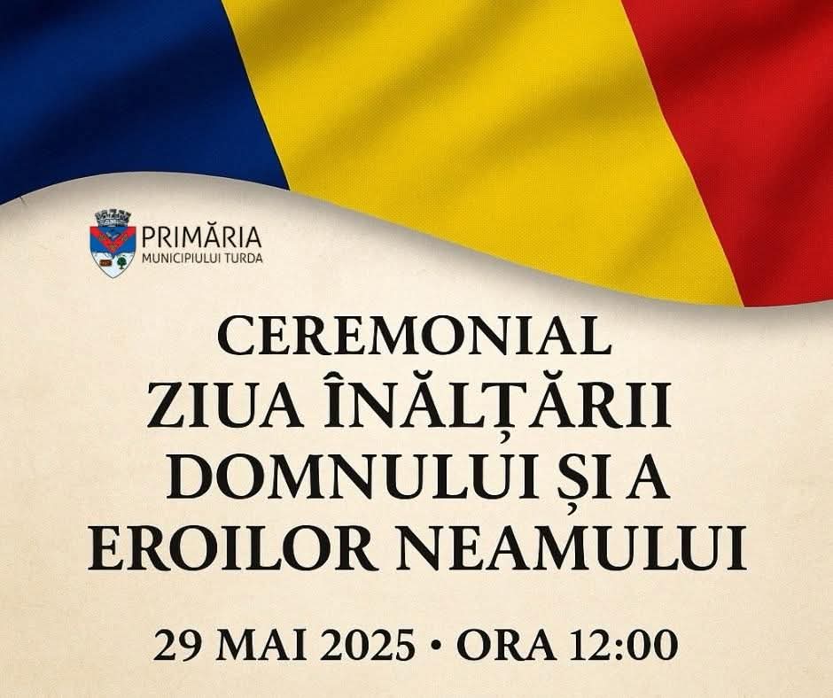 Joi, 29 mai 2025, vă invităm să fim împreună la ceremonialul militar-religios organizat cu ocazia Zilei Înălțării Domnului și a comemorării Eroilor Neamului, începând cu ora 12:00, la Monumentul Eroilor, în fața Catedralei Ortodoxe din Turda.