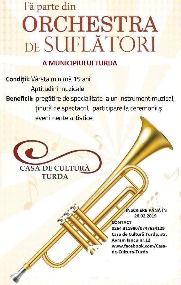 Turda își face orchestra de suflători. Dacă ai vârsta minimă de 15 ani și aptitudini muzicale, ești candidatul perfect. Cursurile de inițiere au început, dar încă mai avem locuri și instrumente disponibile. Vei face parte dintr-un grup de artiști în devenire, care descoperă arta muzicii cu un profesor ce instruiește orchestre de suflători de peste 20 de ani. Înscrierile se pot face pana pe 20 februarie. Alte detalii găsiți pe pagina de Facebook a Casei de Cultură din Turda dar și la numărul de telefon 0264311980, vă așteptăm.