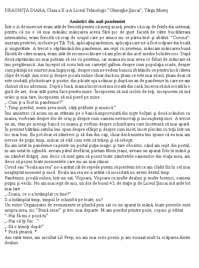 Biblioteca Municipală „Teodor Murăşanu” Turda în parteneriat cu Școala Gimnazială ”Teodor Murășanu” Turda a organizat în perioada 5- 28 Mai 2021, a XVI-a ediție a concursului de eseuri. Tema din acest an a acestui concurs nu a mai fost lectura, ca în anii precedenți, ci ”Amintiri din anii pandemiei”.Concursul s-a desfășurat pe 2 secțiuni: una dedicată elevilor de gimnaziu și alta dedicată liceenilor din toate judetele țării.