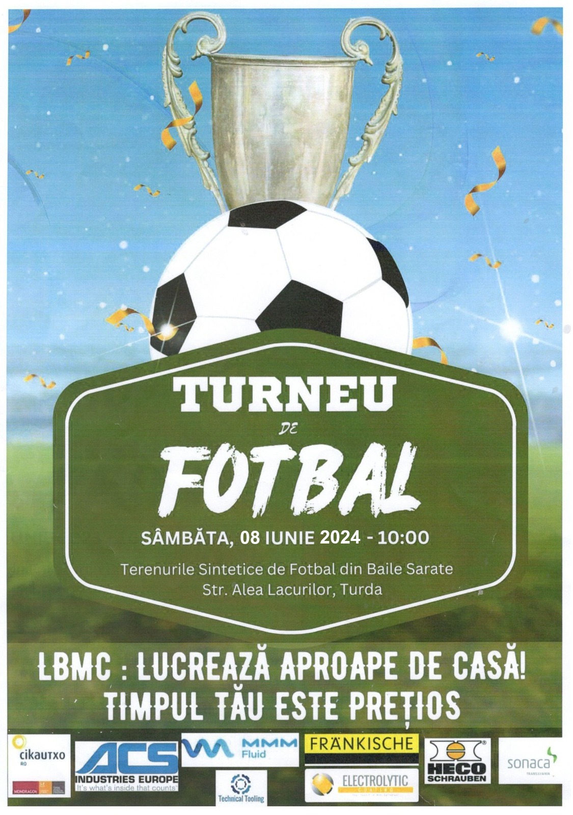 Sâmbătă, 08 iunie 2024, de la ora 10:00, pe terenurile sintetice din Băile Sărate Turda, va avea loc un turneu de fotbal sub egida ,,Local businesses manufacturing cluster”, iar motto-ul este ,,Lucrează aproape de casă, timpul tău e prețios”.