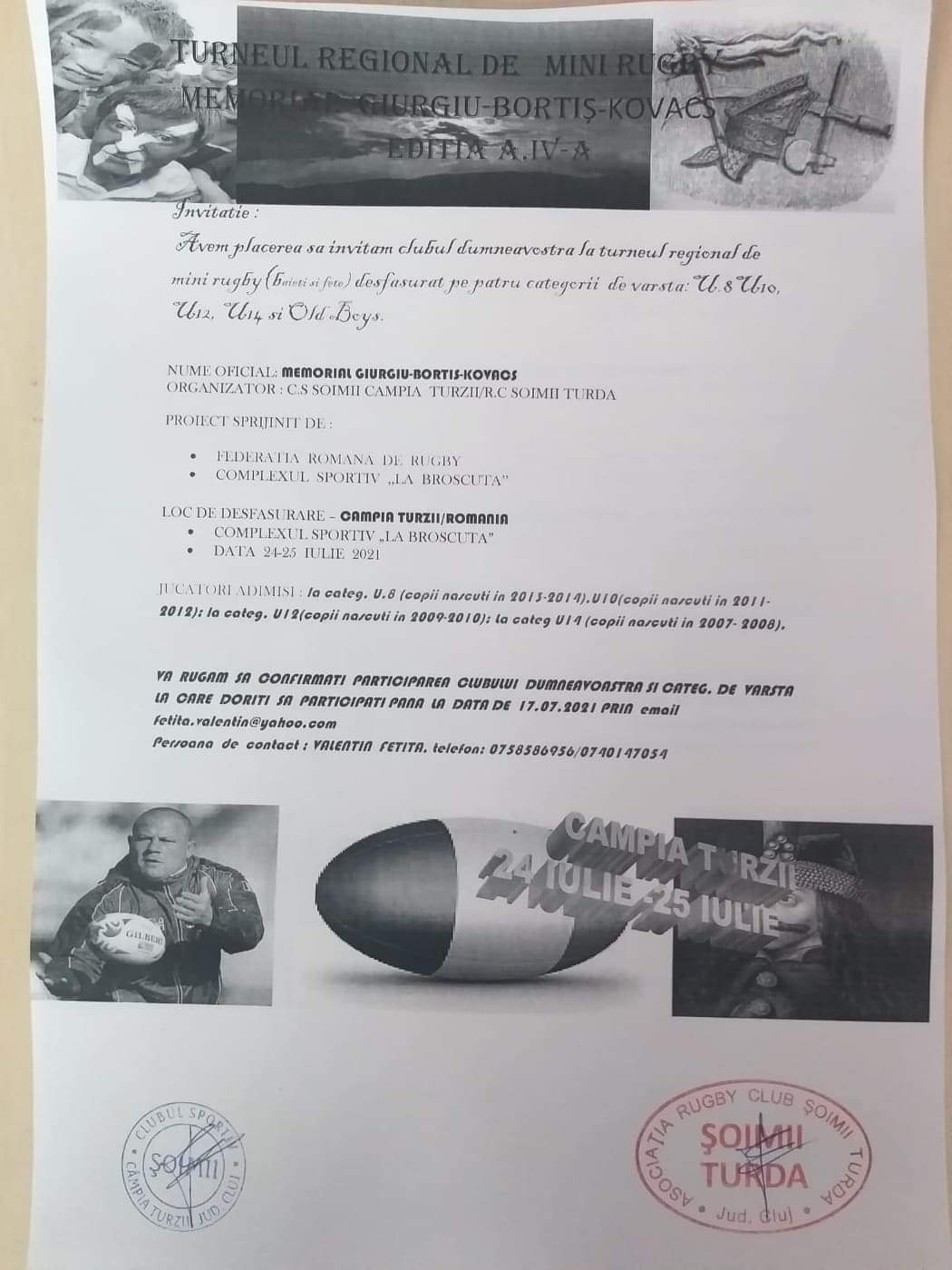 În perioada 24-25 iulie 2021, Clubul Șoimii Câmpia Turzii în parteneriat cu Șoimii Club Turda și Federația Română de Rugby organizează pe terenul de sport al Complexului Turistic ”La Broscuța” cea de-a V-a, ediție de mini-rugby a memorialului Giurgiu Bortiș Kovacs. La acest turneu și-au anunțat participarea Club Sportiv Steaua București, CSS Viitorul Cluj, Rugby Club Junior, Florin Popovici Baia-Mare, Venus Rifil Baia-Mare și echipele gazde Club Sportiv Șoimii Câmpia Turzii și Șoimii Club Turda.