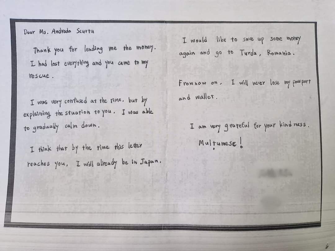 Având în vedere situația în care se afla tânărul, Andrada, ofițer de poliție în cadrul Biroului de Investigații Criminale, i-a eliberat o adeverință pentru documentele pierdute, luând legătură cu secția consulară din cadrul Ambasadei Japoniei pentru a-l ajuta pe tânăr să ajungă acasă.