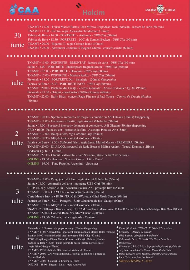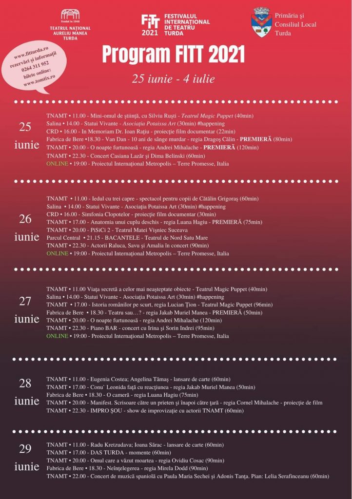 „În cazul în care nu știți ce reprezentații să alegeți, găsiți detalii despre spectacole aici: https://www.fitturda.ro/program/, iar bilete online aici: https://www.tomtix.ro/evenimente-teatrul-national-aureliu-manea-turda-62