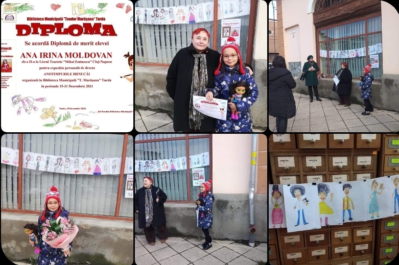 Biblioteca Municipală ”Teodor Murășanu” Turda a organizat azi în cadru restrâns, respectând prevederile legislative în vigoare privind pandemia de COVID-19, un scurt vernisaj al expoziției personale de desene realizate de Ana Irina Moldovan, ANOTIMPURILE IRINUCĂI. Expoziția cuprinde 31 de portrete cu teme diferite: autoportret, portretul mamei și a străbunicii, portrete ale unor personaje din cărțile citite (Malala, Anne Frank, Mama și Tata porc, Elsa, Ana, Olaf, personaje din Cartea Cărților etc.), dar și portrete cu tematică religioasă (Isus, Fecioara Maria, Noe, Maica Tereza, Adam și Eva). Evenimentul constituie o premieră pentru biblioteca turdeană, fiind pentru prima dată când la Galeria de artă a instituției organizăm o expoziție personală a unui copil. La vernisaj Dana Deac a vorbit despre activitatea culturală a Irinei, amintind și faptul că aceasta s-a implicat în mai multe evenimente culturale ale Turzii, între care și unele organizate de Biblioteca Municipală ”Teodor Murășanu” Turda, deși este elevă în clasa a II-a la Liceul Teoretic ”Mihai Eminescu” din Cluj-Napoca.