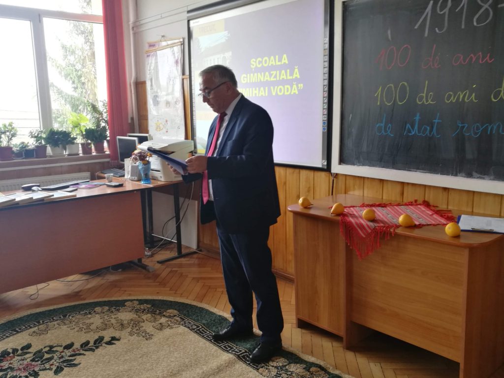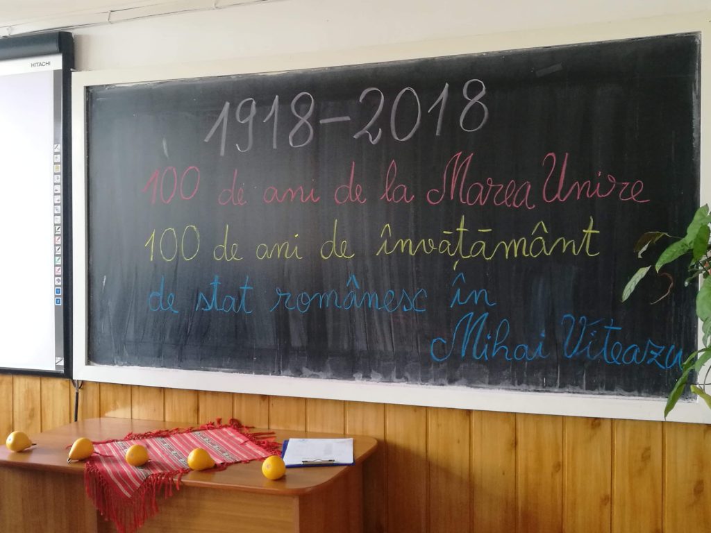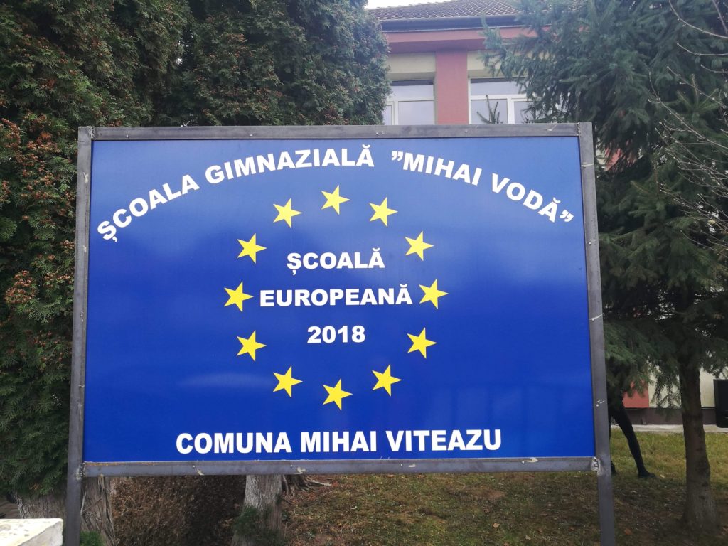 “100 de ani de la Marea Unire, 100 de ani de învățământ de stat românesc în Mihai Vitezu”, cu aceste cuvinte s-a deschis această ceremonie, scris frumos in trei culori pe tablele sălii unde a avut loc evenimentul. Coincidență sau nu, tot astăzi, 26 Octombrie, a fost dezvelită tabla din curtea şcolii ce atestă că Scoala Gimnazială “Mihai Vodă” este Şcoala Europeană din 2018. Dacă la intrarea în Comuna Mihai Viteazu, ne întâpină un indicator rutier cu intrarea în localitate alături de alt indicator “Sat European” acum ne putem mândri cu acest statut şi la şcoala din localitate.