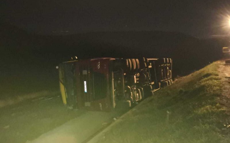Potrivit martorilor oculari, conducătorul auto, care ar fi avut o alcoolemie în aerul expirat de 1,20 mg/l, a pierdut controlul asupra autovehiculului într-o curbă, iar vehiculul de mare tonaj s-a răsturnat.