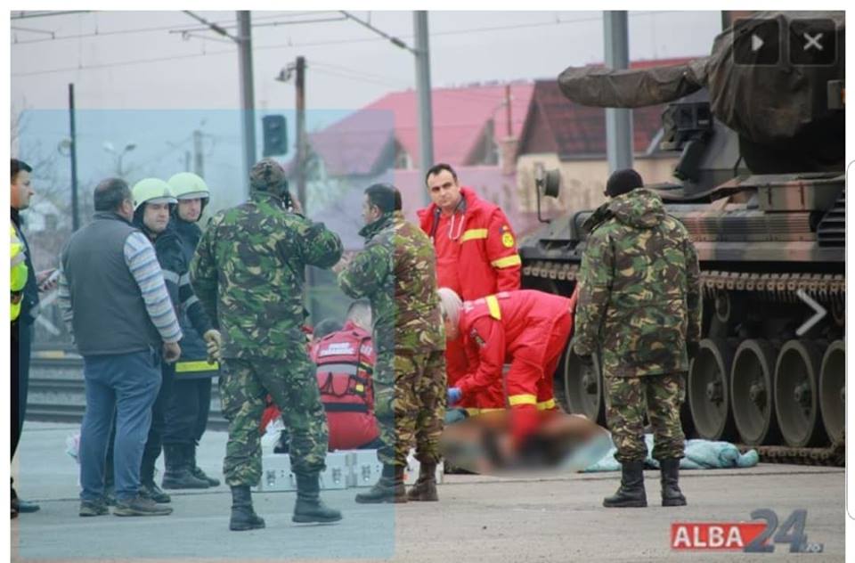 Alba Iulia. Un soldat s-a electrocutat după ce s-a urcat pe unul din tancuri. Acesta s-ar fi atins de la linia de curent a căii ferate care se pare că în mod normal ar fi trebuit să fie fără curent, potrivit celor de la fața locului.
