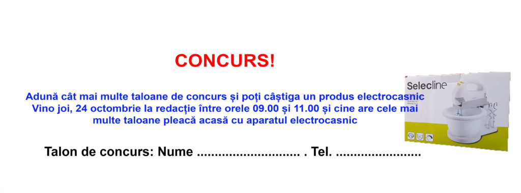 Premiul săptămânii 21-27 octombrie este un mixer multifuncțional. Adună cât mai multe taloane de concurs de pe prima pagină a Ziarului 21 și vino joi, 24 octombie la redacția ziarului între orele 10.00 și 11.00 și poți pleca acasă cu premiul!