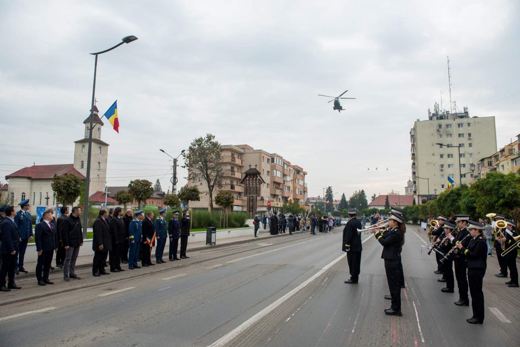 După depunerile de coroane, cetățenii municipiului Câmpia Turzii care au participat la evenimentul au putut privi defilarea Detașamentului de onoare al Bazei 71 Aeriană în timp ce elicopterele IAR 330 au survolat cerul municipiului.
