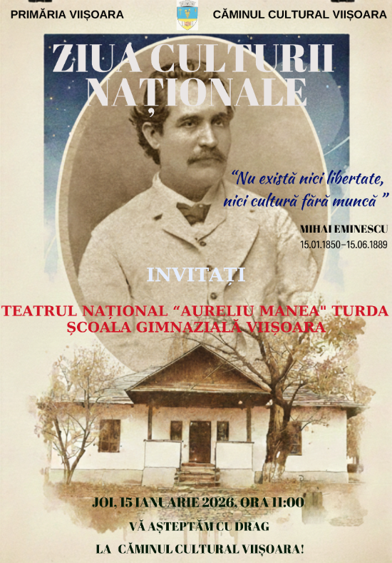 Comunitatea din Viișoara este invitată joi, 15 ianuarie 2026, începând cu ora 11:00, la Căminul Cultural Viișoara, pentru a marca Ziua Culturii Naționale, printr-un eveniment special dedicat poetului național Mihai Eminescu.