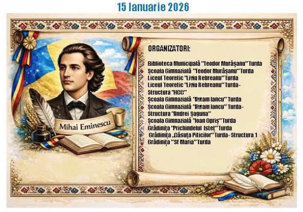 Pe 15 ianuarie, Turda celebrează cultura română și opera lui Mihai Eminescu prin evenimente organizate de instituțiile de cultură din municipiu.