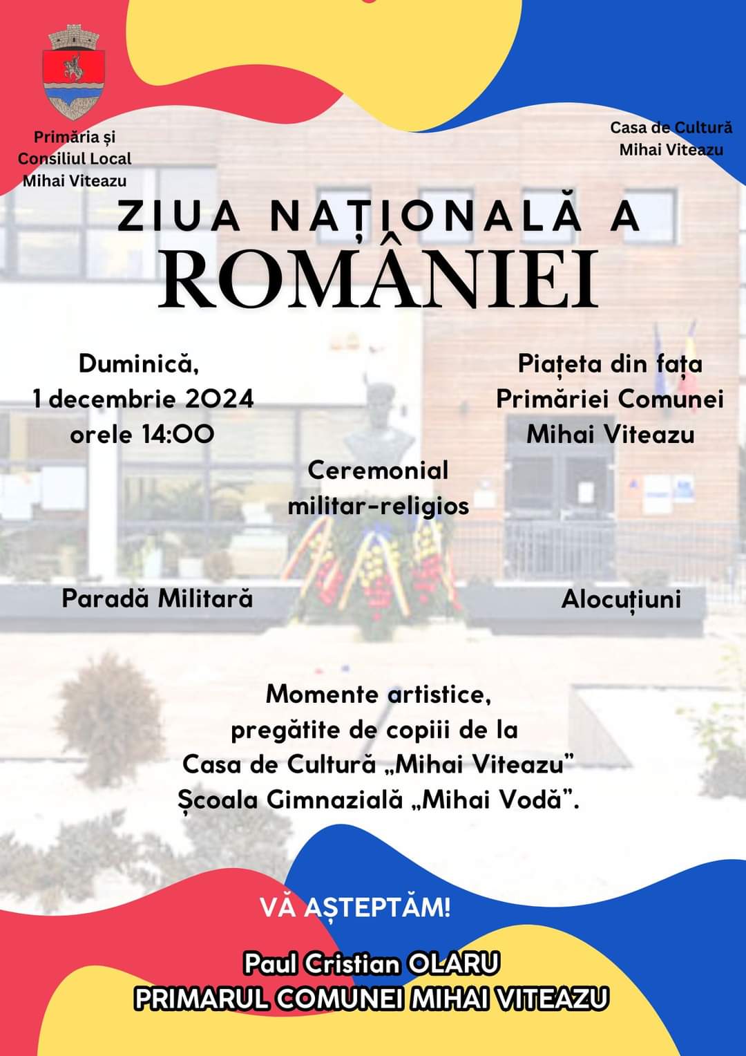 Primăria și Consiliul Local Mihai Viteazu, împreună cu Casa de Cultură „Mihai Viteazu”, vă invită să sărbătorim împreună Ziua Națională a României!