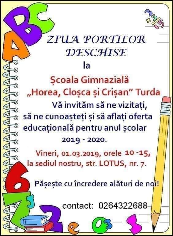Ziua porților deschise la Școală Gimnazialã „Horea Cloșca și Crișan” din Turda. Acest eveniment va avea loc vineri, 1 martie, de la orele 10 până la ora 15. Toți părinții, viitori elevi și bunicii sunt așteptați.
