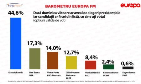 Sondajul realizat de IMAS, la comanda Europa FM, arată că favorit rămâne Klaus Iohannis, cu aproape 45 de procente. Următorul clasat, la...