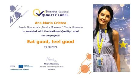 „Suntem extrem de mândri să anunțăm că echipa școlii noastre a obținut Certificatul Național de Calitate (Quality Label) pentru proiectul eTwinning „Eat...