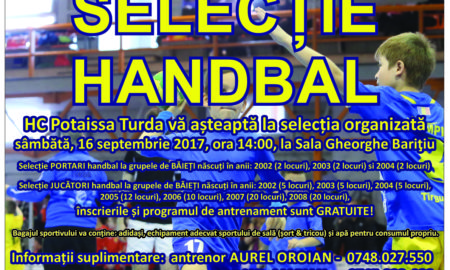 HC Potaissa Turda vă aşteaptă la selecţia organizată sâmbătă, 16 septembrie 2017, ora 14, la Sala Gheorghe Bariţiu. Selecţie PORTARI handbal la...