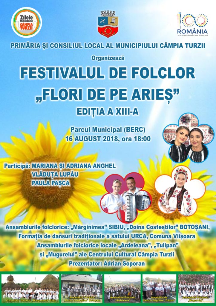 Din aceste considerente, administrația locală a Municipiului Câmpia Turzii organizează, în ziua de joi, 16 august 2018, cea de-a XIII-a ediție a festivalului folcloric “Flori de pe Arieş”, devenit un simbol al comunităţii noastre.