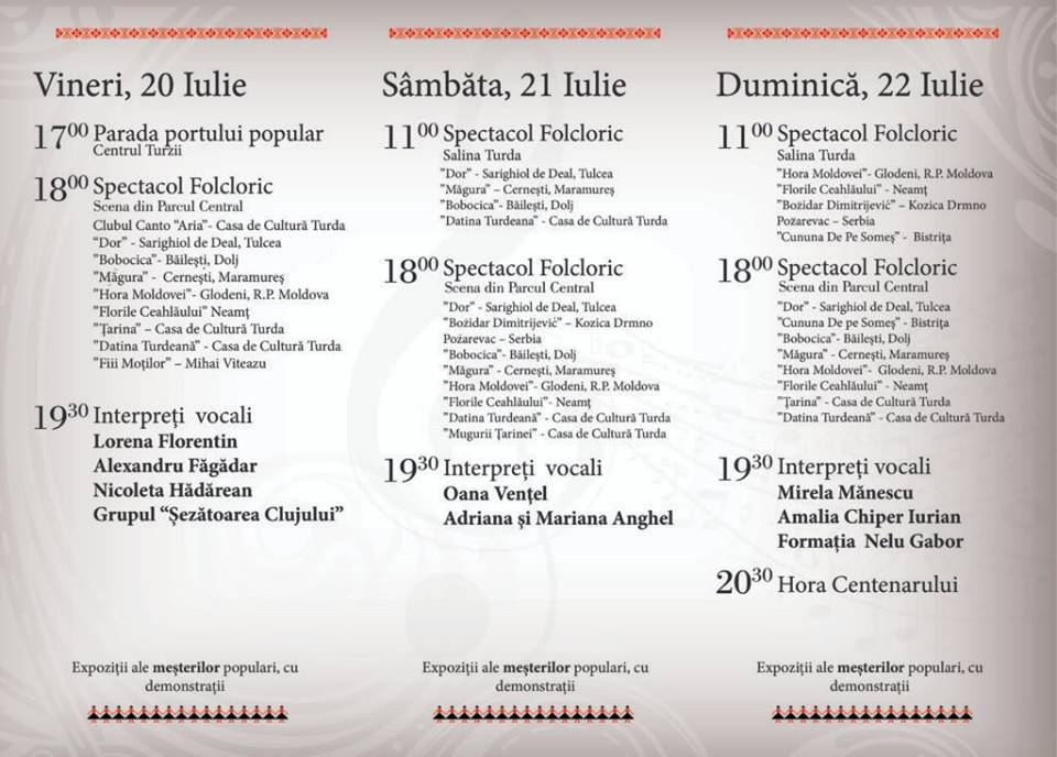 „Este foarte important acest Festival de Folclor, „În grădina dorului”, pentru toată comunitatea din Turda. Este foarte important să nu ne uităm tradițiile, valorile și tot ceea ce ține de cultura noastră românească. Vă invit într-un număr cât mai mare să luați parte la prima ediție a acestui Festival de Folclor, unde o să vedeți o mulțime de ansambluri folclorice din țară, dar și din străinătate. Vă rog pe toți cei care participați să veniți îmbrăcați în costum popular tradițional. De asemenea, pe lângă parada portului popular, expozițiile meșterilor populari, ansambluri și interpreți vocali, care o să vă cânte și o să vă încânte în fiecare seară de la 19:30, de vineri până duminică, în data de 22 iulie, începând cu orele 20:30 o să întindem o horă a Centenarului în Parcul Central Turda unde sperăm din tot sufletul să veniți într-un număr cât mai mare pentru a ne bucura împreună de însemnătatea acestor zile, benefice pentru populația din Turda și pentru turiștii care aleg să viziteze municipiul nostru în perioada 20-22 iulie”, a declarat pentru Ziarul 21, Amalia Chiper.