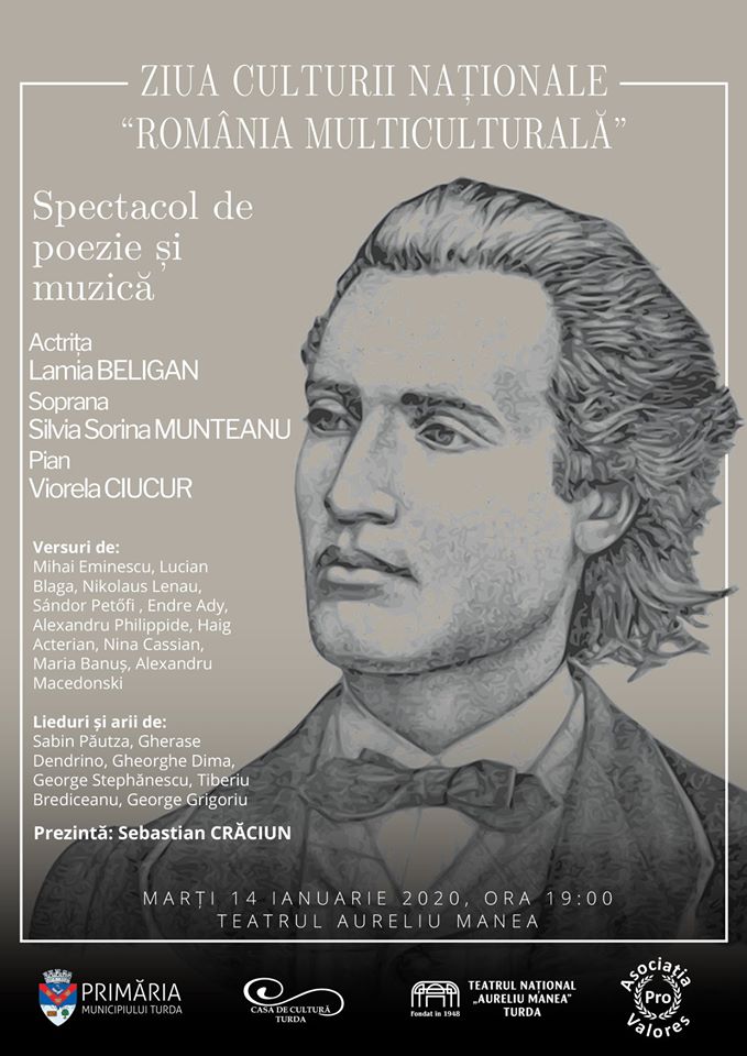 Cultura Națională va fi celebrată la Turda prin spectacolul- eveniment ROMÂNIA MULTICULTURALĂ, susținut de actrița LAMIA BELIGAN, soprana SILVIA SORINA MUNTEANU și pianista VIORELA CIUCUR. Cele trei artiste ne propun un recital poetico-muzical care va reliefa una dintre caracteristicile fundamentale ale României – multiculturalismul.