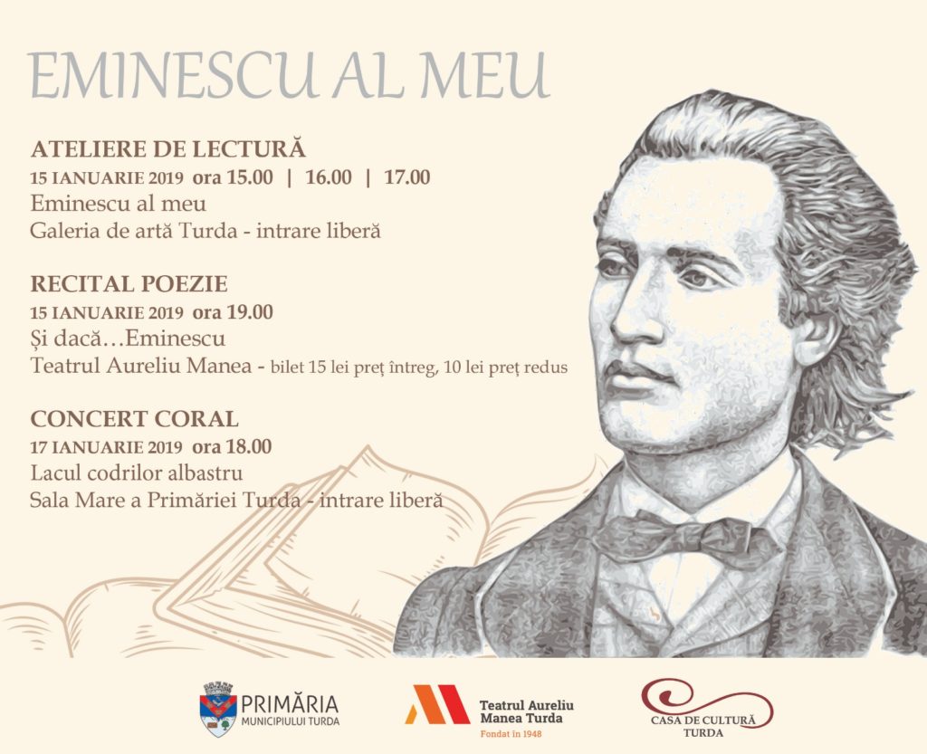 Primăria Municipiului Turda, Teatrul ,,Aureliu Manea” și Casa de Cultură a Municipiului Turda organizează, în data de 15 ianuarie, o serie de evenimente culturale cu prilejul împlinirii a 169 de ani de la nașterea marelui poet național, marcând astfel și ”Ziua Culturii Naționale”.