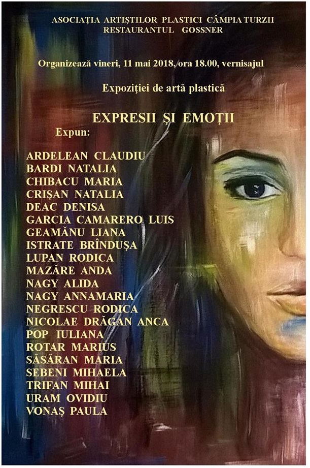 Asociaţia Artiştilor Plastici Câmpia Turzii şi Restaurantul Gossner din Câmpia Turzii organizează Vineri, 11 Mai 2018, începând cu orele 18, vernisajul expoziţiei intitulate sugestiv „Expresii și Emoții”. Expoziția cuprinde de lucrări abordând diferite tehnici de pictură, având ca temă portretul.