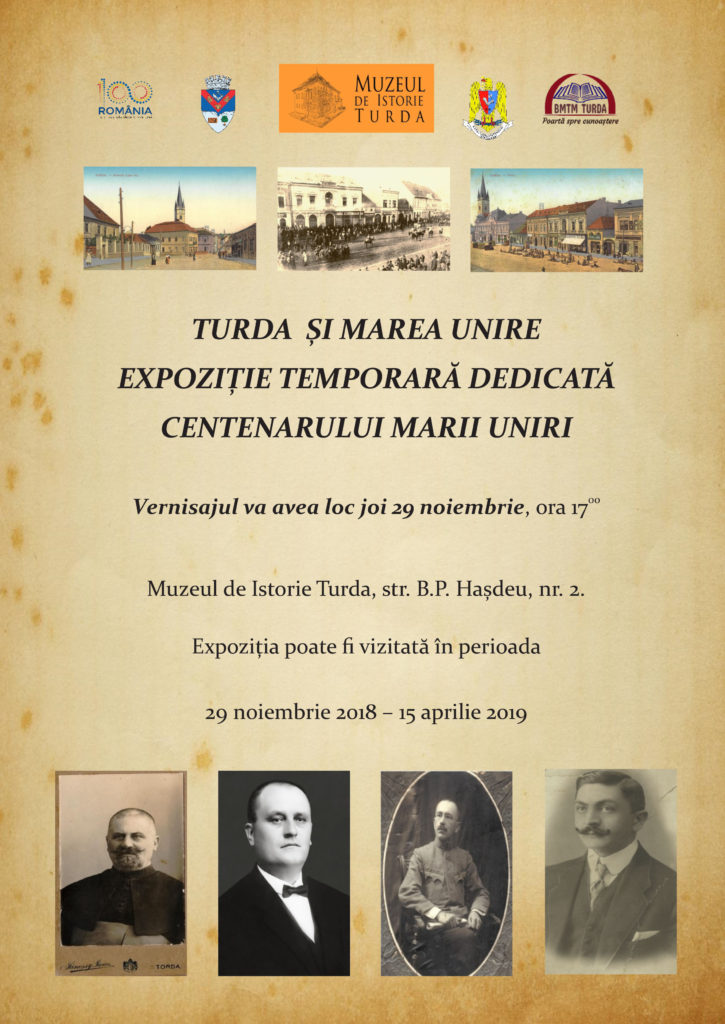 Alături de proiectele culturale și expoziționale dedicate Centenarului Marii Uniri derulate în mai multe etape, Muzeul de Istorie Turda, în colaborare cu alte instituții din localitate și din țară, propune publicului său expoziția temporară Turda și Marea Unire, care va fi vernisată joi, 29 noiembrie, ora 17.00 la Muzeul de IstorieTurda, str. B.P. Hașdeu, nr. 2.