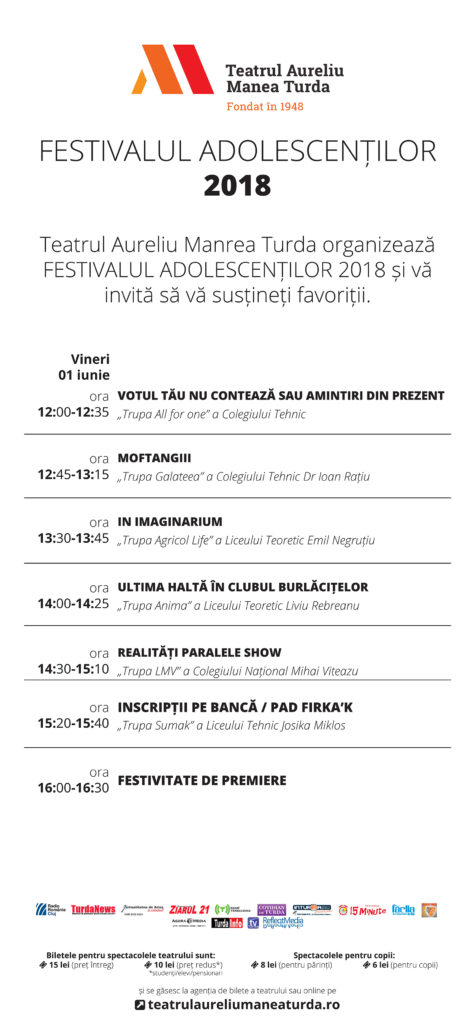 Teatrul Aureliu Manea Turda în parteneriat cu liceele din oraș, organizează în data de 01 iunie 2018 Festivalul Adolescenților și vă invită să vă susțineți favoriții. Aceasta este prima ediție și reprezintă rezultatul muncii unor actori dedicați și a copiilor talentați din oraș.