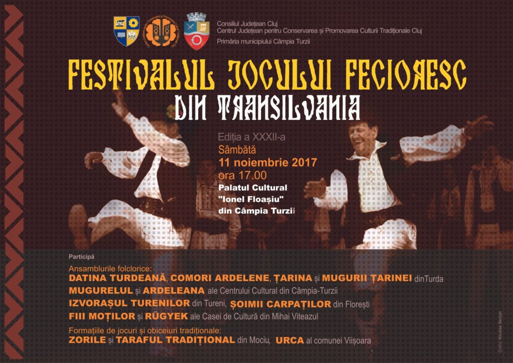 Centrul Județean Pentru Conservarea și Promovarea Culturii Tradiționale Cluj, instituție de cultură aflată în subordinea Consiliului Județean Cluj, în parteneriat cu Primăria Municipiului Câmpia Turzii, organizează sâmbătă, 11 noiembrie 2017, de la ora 17.00, la Palatul Cultural „Ionel Floașiu” din Câmpia Turzii, cea de-a XXXII- a ediție a ,,Festivalului Jocului Fecioresc din Transilvania”.