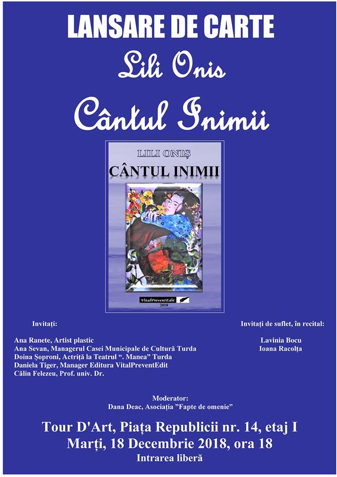 Marţi, 18 Decembrie 2018, de la ora 18.00, Tour D’Art (Turda, Piaţa Republicii nr. 14, la etaj) va găzdui lansarea volumului de poezii “Cântul inimii” purtând semnătura scriitoarei turdence Lili Oniş.