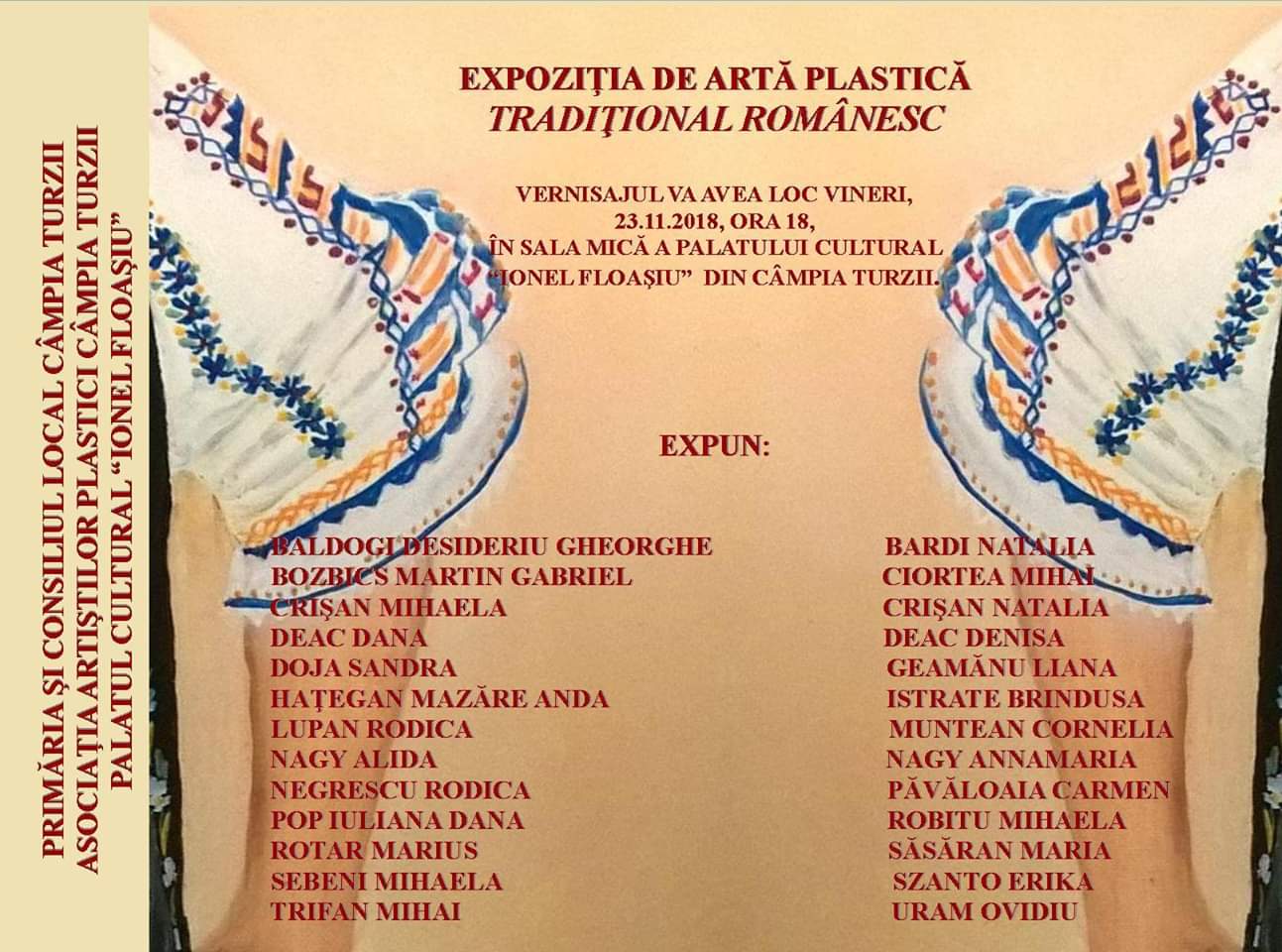 Asociația Artiștilor Plastici din Câmpia Turzii, în parteneriat cu Primăria Municipiului Câmpia Turzii prezintă, vineri, 23.11.2018, vernisajul intitulat „Tradițional românesc”.