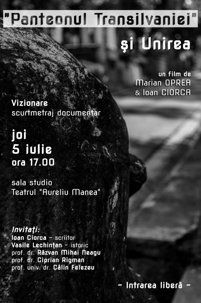 Joi, 5 iulie, de la orele 17.00 are loc – în cadrul ediţiei din 2018 a Festivalului Internaţional de Teatru de la Turda – vizionarea scurtmetrajului documentar “«Panteonul Transilvaniei» şi Unirea”, evenimentul având loc în nou amenajata sală studio a Teatrului “Aureliu Manea” din Turda.