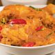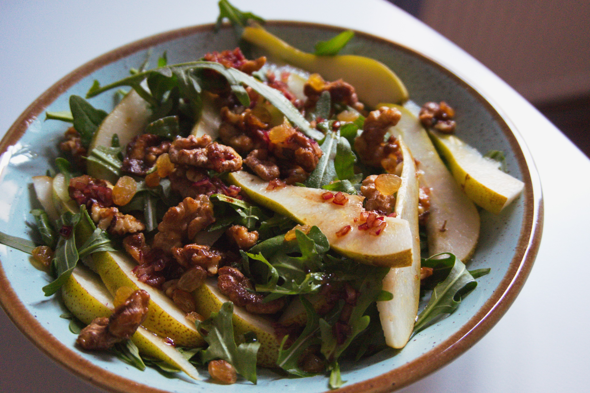 Se pun restul ingredientelor într-o farfurie, se presară nucile pe deasupra și se toarnă sos din plin. Poftă să aveți!