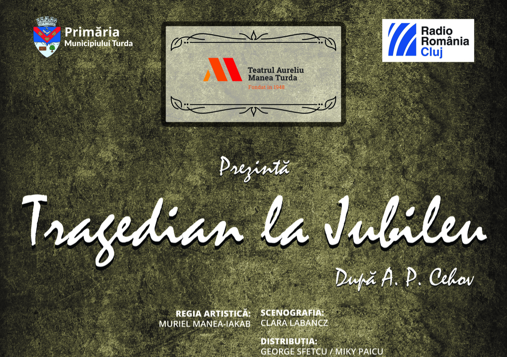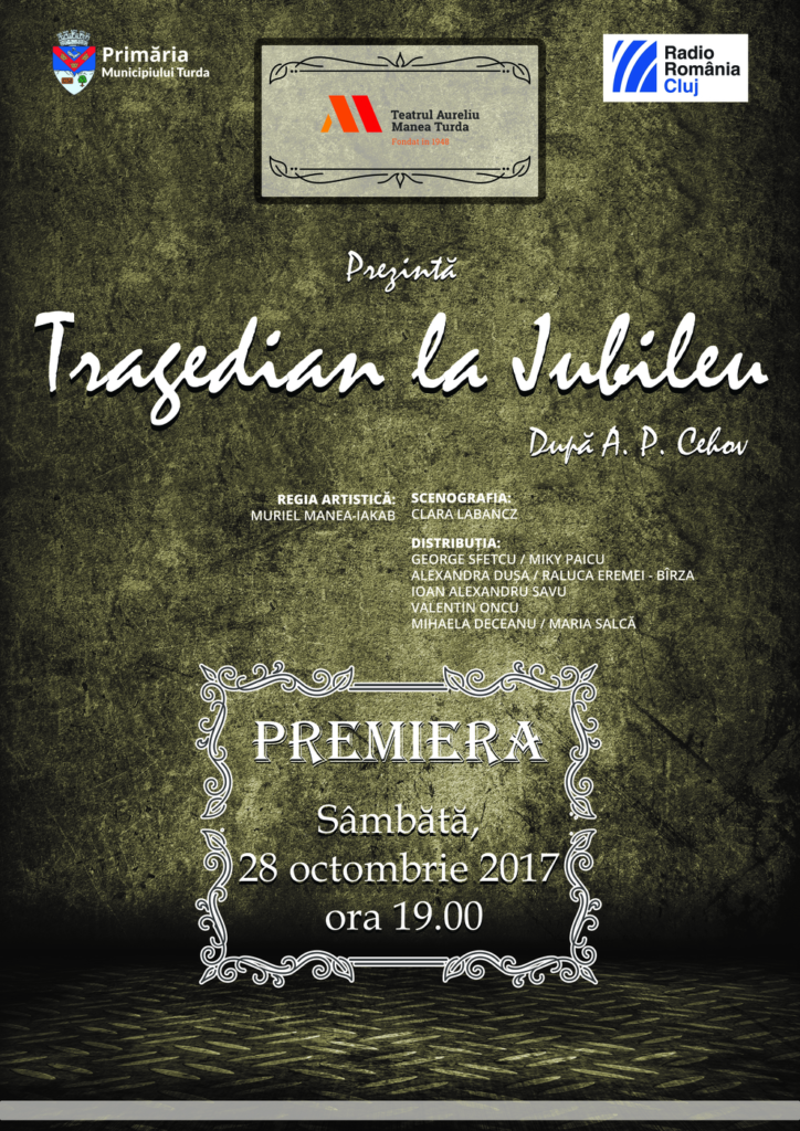 Teatrul Aureliu Manea Turda vă invită, sâmbătă 28 octombrie, ora 19.00, la o nouă premieră teatrală, „Tragedian la Jubileu” – după A. P. Cehov, în regia lui Muriel Manea-Iakab.