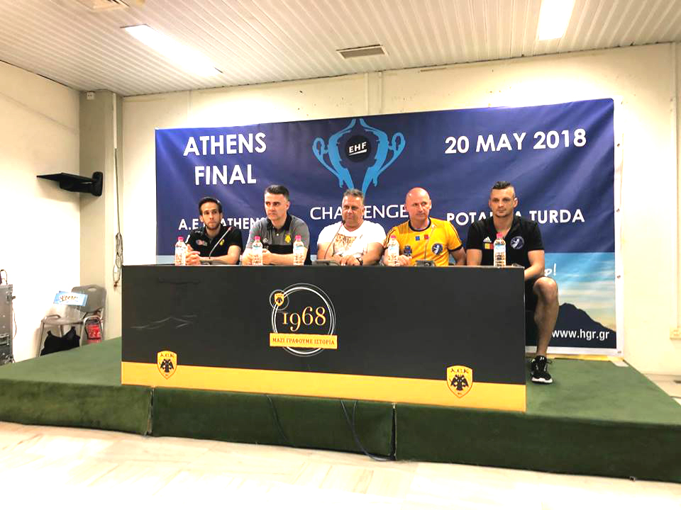 Turdenii au susţinut, deja, o conferinţă de presă la Nikos Galis Olympic Hall, cea mai mare sală din Europa care duminică, în întreaga ei istorie de 23 de ani, găzduieşte primul meci de handbal, aici disputându-se doar meciuri de baschet.