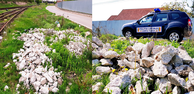 În urmă cu câteva zile, chiar înaintea Sărbătorilor Pascale, agenții de Poliție Locală au surprins un cetățean al cartierului Șarât din Municipiul Câmpia Turzii, care a depozitat în mod necontrolat o cantitate de aproximativ 4 mc. deșeuri rezultate din contrucții, beton, pe terenul situat la intersecția străzilor Nicolae Titulescu cu Tărnavelor, între liniile de cale ferată industrială și limitrof imobilului pe strada Nicolae Titulescu, numărul 1.