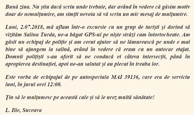 „,,Lucrurile mici fac diferența!”…au demonstrat-o colegii noștri, agent-sef principal de politie Octavian Borsan si agent-sef adjunct de politie Alin Suciu, ambii din cadrul Politiei municipiului Turda, care au primit o scrisoare de multumire din partea unui conducator auto cu o experienta in domeniu de peste 30 de ani!