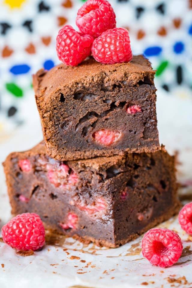 Amestecati usor zmeura in compozitia de brownie, apoi turnati-o in tava de copt.