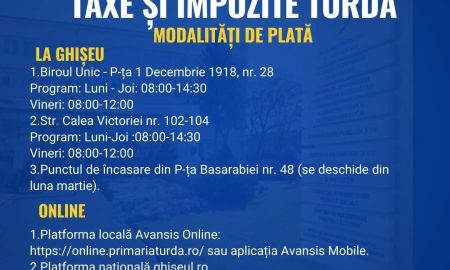 Impozitele ศi taxele locale, precum ศi ratele ศi chiriile pot fi achitate la ghiศeele Primฤriei Municipiului Turda sau prin intermediul platformelor online...
