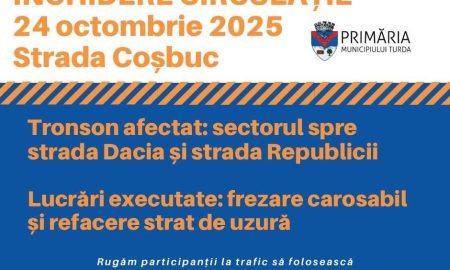 Pentru desfășurarea în siguranță a lucrărilor de reparații / reabilitare a străzii Alba Iulia din municipiul Turda, din data de 25.07.2024, între...
