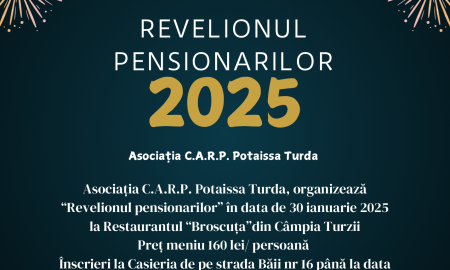 Asociația C.A.R.P. Potaissa Turda organizează “Revelionul pensionarilor”. Petrecerea se va organiza la Restaurantul “Broscuța” din Câmpia Turzii, în data de 30 ianuarie...