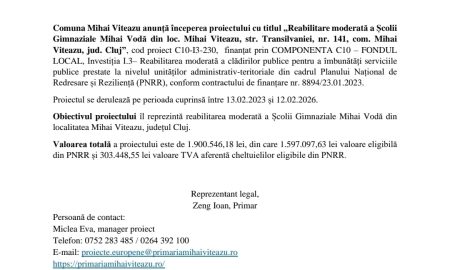 Comuna Mihai Viteazu anunță începerea proiectului cu titlul „Reabilitare moderată a Școlii Gimnaziale Mihai Vodă