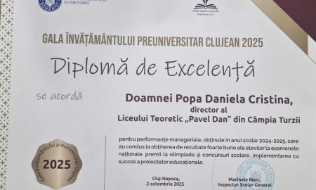 Directorul Liceului Teoretic „Pavel Dan” din Câmpia Turzii, doamna Popa Daniela Cristina a obținut diploma de excelență la Gala Învățământului Preuniversitar Clujean
