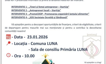 Primăria Comunei Luna aduce la cunoștința cetățenilor și mediului antreprenorial local organizarea unei sesiuni de informare și animare dedicate oportunităților de finanțare...