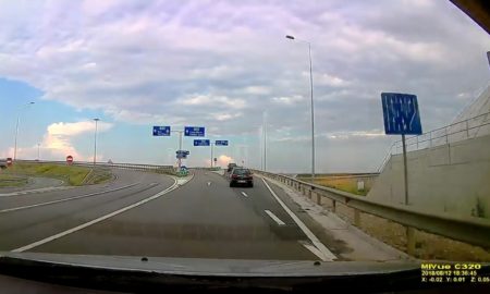 Un autoturism a fost surprins de camera de bord a unui participant la trafic în timp ce se deplasa pe contrasens pe...