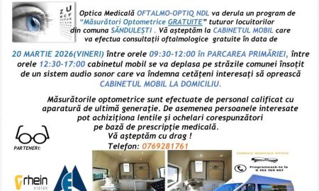 Primăria Comunei Săndulești vă informează că, în data de 20 martie 2026 (vineri), în localitatea noastră va ajunge un cabinet mobil de...