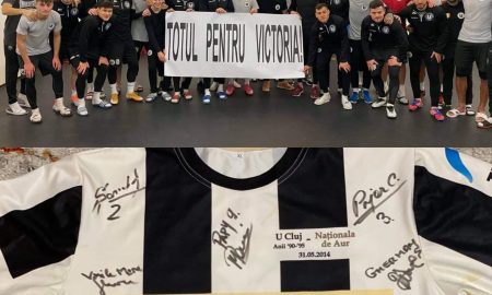 Fotbaliștii Universității Cluj, alături de Victoria Maria. Călin Dringo, maseorul echipei, scoate la licitație un tricou semnat de Generația de Aur a Universității