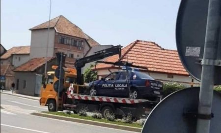 I-au ajuns „urările” șoferilor cu mașini ridicate: O mașină a poliției locale din Alba Iulia, la rândul ei pe platformă. O mașină...