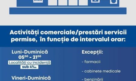 Activitățile comerciale sau prestările de servicii sunt permise, în funcție de intervalul orar, după cum urmează: ☑️ În localitățile în care incidența...